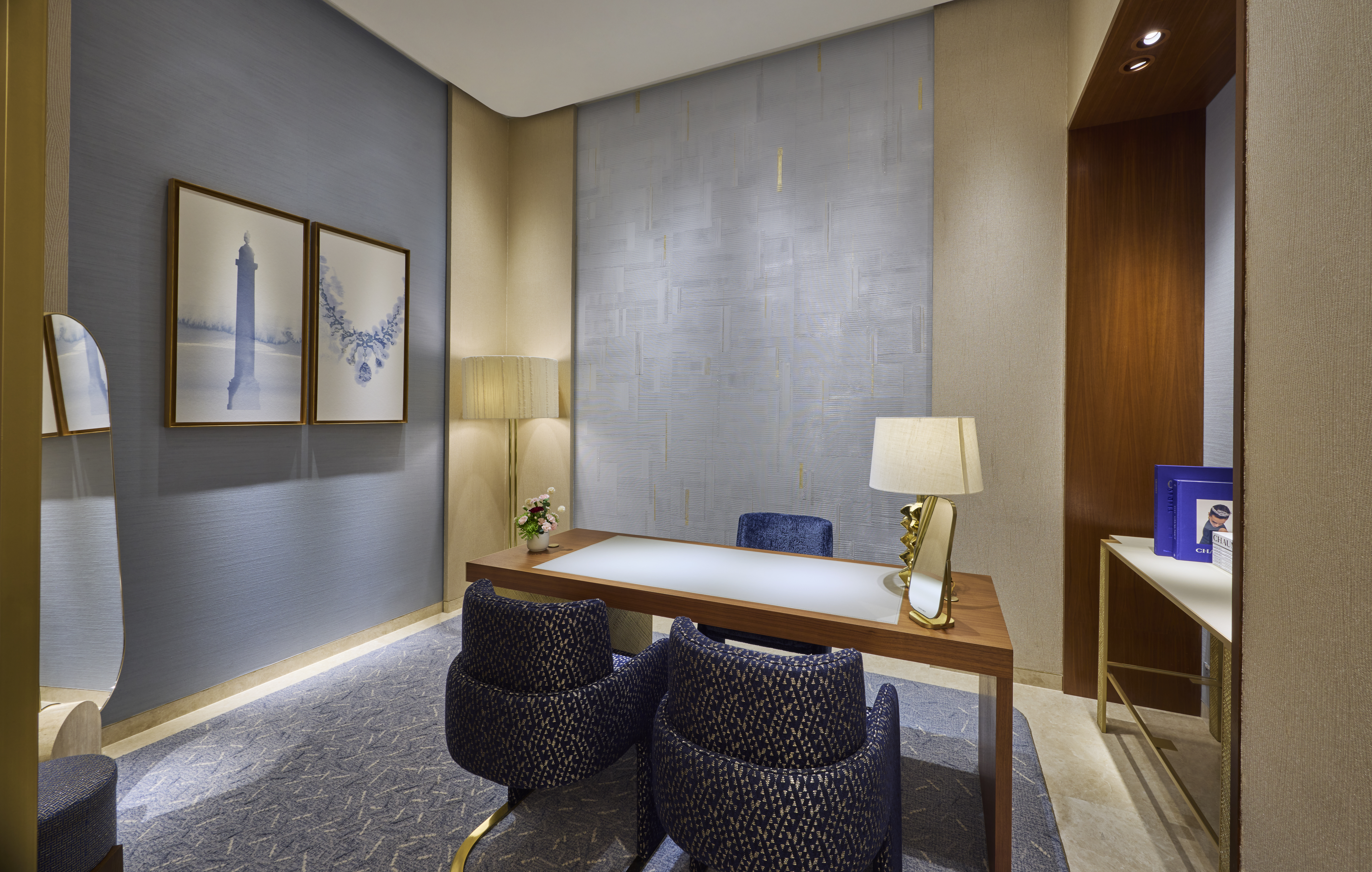 Its interiors feature Chaumet’s distinctive blue set against textured murals, golden wheat motifs, nickel silver models and finely crafted bas-reliefs.